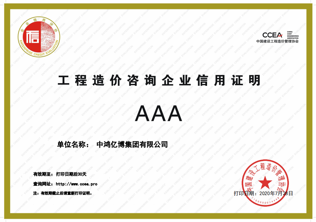 其中,中鴻億博集團(tuán)有限公司憑借良好的生產(chǎn)經(jīng)營(yíng)業(yè)績(jī)、健全的組織管理體系,良好的財(cái)務(wù)狀況及優(yōu)秀的履約能力以及在誠(chéng)信建設(shè)方面的管理手段,順利通過中國(guó)建設(shè)工程造價(jià)管理協(xié)會(huì)社會(huì)信用評(píng)價(jià)AAA級(jí)信用評(píng)審,標(biāo)志著中鴻億博集團(tuán)有限公司在企業(yè)誠(chéng)信建設(shè)上又邁向了新臺(tái)階。