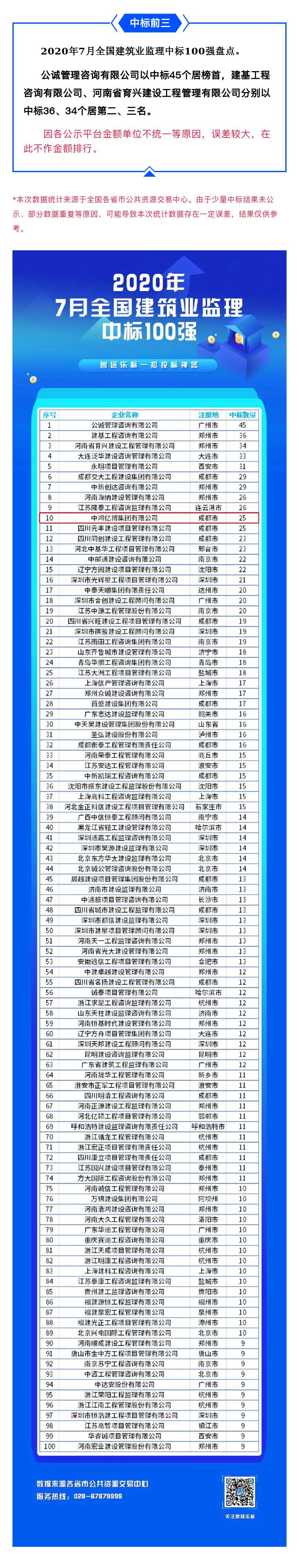 集團(tuán)挺進(jìn)2020年7月建筑業(yè)監(jiān)理中標(biāo)數(shù)量全國前十強
