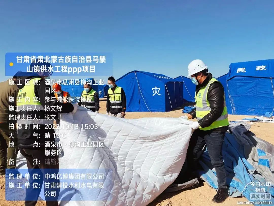 與此同時,在距離方艙建設地3公里處的中鴻億博集團監(jiān)理項目——甘肅省肅北蒙古自治縣馬鬃山鎮(zhèn)供水工程總監(jiān)張文在收到急需支援的需求后,以億博正能量精神、億博擔當,主動請纓,并召集了3名項目部人員積極投身志愿行動,用點點微光點亮希望之光,用實際行動將方艙打造為“暖艙”。