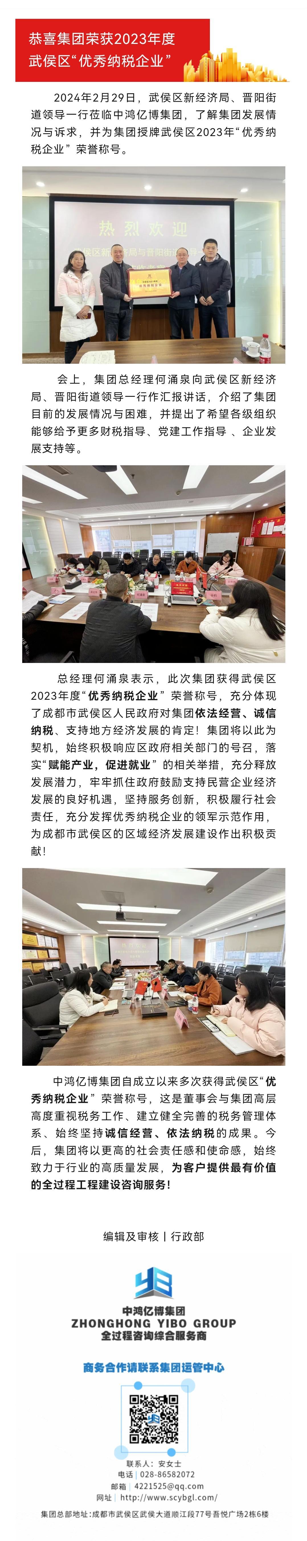 億博動態(tài)丨誠信經(jīng)營 依法納稅—恭喜集團榮獲2023年度武侯區(qū)“優(yōu)秀納稅企業(yè)”稱號